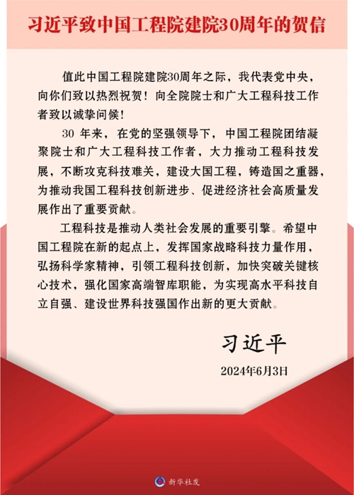 視頻來源:中央廣播電視總臺 習(xí)近平致信祝賀中國工程院建院30周年強調(diào) 發(fā)揮國家戰(zhàn)略科技力量作用 為實現(xiàn)高水平科技自立自強建設(shè)世界科技強國作出新的更大貢獻 丁薛祥出席院士座談會并講話 新華社北京6月3日電 在中國工程院建院30周年之際,中共中央總書記、國家主席、中央軍委主席習(xí)近平發(fā)來賀信,代表黨中央致以熱烈祝賀,向全院院士和廣大工程科技工作者致以誠摯問候。 習(xí)近平在賀信中指出,30年來,在黨的堅強領(lǐng)導(dǎo)下,中國工程院團結(jié)凝聚院士和廣大工程科技工作者,大力推動工程科技發(fā)展,不斷攻克科技難關(guān),建設(shè)大國工程,鑄造國之重器,為推動我國工程科技創(chuàng)新進步、促進經(jīng)濟社會高質(zhì)量發(fā)展作出了重要貢獻。 習(xí)近平強調(diào),工程科技是推動人類社會發(fā)展的重要引擎。希望中國工程院在新的起點上,發(fā)揮國家戰(zhàn)略科技力量作用,弘揚科學(xué)家精神,引領(lǐng)工程科技創(chuàng)新,加快突破關(guān)鍵核心技術(shù),強化國家高端智庫職能,為實現(xiàn)高水平科技自立自強、建設(shè)世界科技強國作出新的更大貢獻。 3日上午,中國工程院在京舉行“踐行工程科技使命 推進科技強國建設(shè)”院士座談會。中共中央政治局常委、國務(wù)院副總理丁薛祥出席會議,宣讀習(xí)近平賀信并講話。 丁薛祥在講話中指出,中國工程院成立30年來,堅決貫徹黨中央和國務(wù)院決策部署,大力推動工程科技發(fā)展,匯聚一流創(chuàng)新人才、產(chǎn)出一流科技成果、貢獻一流咨詢建議、打造一流學(xué)術(shù)平臺,在國家發(fā)展進步中發(fā)揮了重要作用。 丁薛祥強調(diào),在新時代新征程上,中國工程院要牢記建院初心、傳承光榮傳統(tǒng),在學(xué)習(xí)貫徹習(xí)近平總書記重要指示精神、為高水平科技自立自強而奮斗的進程中爭當(dāng)排頭兵。要當(dāng)國家戰(zhàn)略科技力量的排頭兵,牢牢把握新一輪科技革命和產(chǎn)業(yè)變革的戰(zhàn)略機遇,奮力搶占科技制高點。要當(dāng)工程科技創(chuàng)新的排頭兵,解決好重大工程科技問題,推進科技創(chuàng)新成果產(chǎn)業(yè)化應(yīng)用,更好服務(wù)新質(zhì)生產(chǎn)力發(fā)展。要當(dāng)突破關(guān)鍵核心技術(shù)的排頭兵,從國家急迫需要和長遠需求出發(fā),加強“卡脖子”技術(shù)攻關(guān),力爭在重要領(lǐng)域取得更多原創(chuàng)性突破。要當(dāng)國家高端智庫建設(shè)的排頭兵,緊緊圍繞具有戰(zhàn)略性方向性全局性的重大問題,加強前瞻性、針對性、儲備性戰(zhàn)略研究,支撐黨和國家決策。丁薛祥希望廣大工程院院士帶頭大力弘揚科學(xué)家精神,把人生理想融入國家和民族的事業(yè)中,深懷愛國之心、秉持報國之志、勇攀科技高峰,不負黨和人民的殷切期望。 座談會上,中國工程院負責(zé)人和院士代表作了發(fā)言。 中國工程院成立于1994年6月3日。30年來,中國工程院牢記中國工程科技界最高學(xué)術(shù)機構(gòu)職責(zé)使命,聚力科技創(chuàng)新、匯聚領(lǐng)軍人才、建設(shè)高端智庫、堅持學(xué)術(shù)引領(lǐng),取得了一系列重大成果。 |