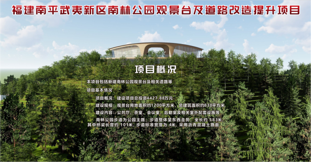 南林公園觀景臺及道路改造提升項目本項目包括新建南林公園觀景臺及相關道路等。建設項目總投資4427.88萬元。建設規(guī)模為觀景臺用地面積約1200平方米,總建筑面積約830平方米,建設內容包含公共廳、茶室、會議室、后勤室及相關室外配套設施等;南林公園步道為公園主路,步道整體呈東西走勢,全長約 583m,其中橋梁長度約 101m,步道標準寬度為 4m,采用瀝青混凝土路面。