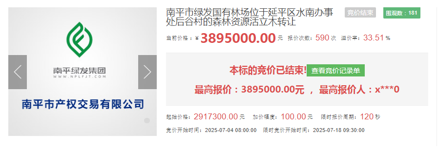近日,延平區(qū)水南辦事處后谷村的森林資源活立木轉(zhuǎn)讓項目在南平市產(chǎn)權(quán)交易有限公司溢價成交。此次標的掛牌價291.73萬元,成交價389.5萬元,溢價97.77萬元,溢價率33.51%,是南平市產(chǎn)權(quán)交易有限公司打造南平市綜合性要素平臺,不斷拓寬交易品種,下沉服務重心的有效嘗試。